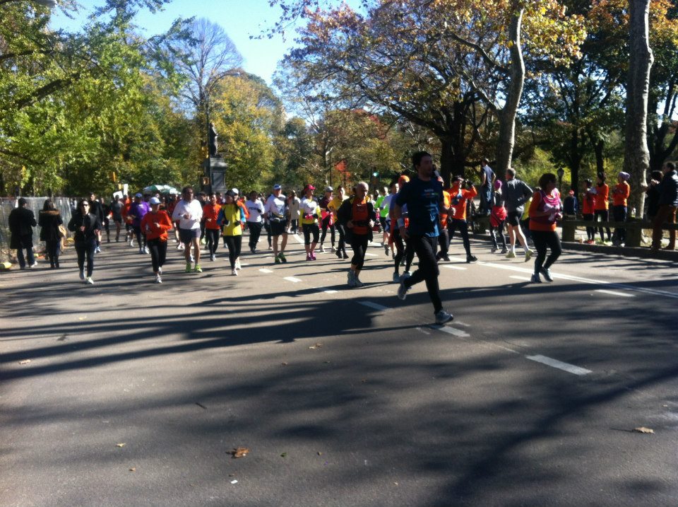 -Vi springer ett marathon i Central Park! Sagt och gjort, ut och köpa lite sen middag samt lite färdkost. Kommer ju inte att finnas några servicestationer direkt! Tillsammans med 50-tal svenskar samlas vi utanför hotellet 06.45. Vilken dag det blir! Solen skiner, helt vindstilla o svalt i luften. Perfekt löpar-väder! När vi börjar springa är det ganska lugnt i parken, vi möter lite löpare men allteftersom klockan går så kommer det fler och fler. Vi håller sällskap och betar av varven, det känns otroligt lätt! Jag vet inte om det är för den enorma löparglädjen vi möts av från alla människor runt omkring. Alla springer och hejar på varandra, det är nästan så att man kan ta på energin! Upp till 37 kilometer så känns det som att vi kan springa hur långt som helst! Men där tar det stopp… energin börjar tryta, kanske att lördagens morgonjogg med en heldag shopping inte har gett den bästa energipåfyllnaden i musklerna? Men med 5 kilometer kvar så är det bara att le och se glad ut! Väl i mål(?) så känns det otroligt skönt att ändå ha sprungit ett marathon i New York, det blev inte som vi hade tänkt oss men vi fick uppleva sann löparglädje från så många människor!